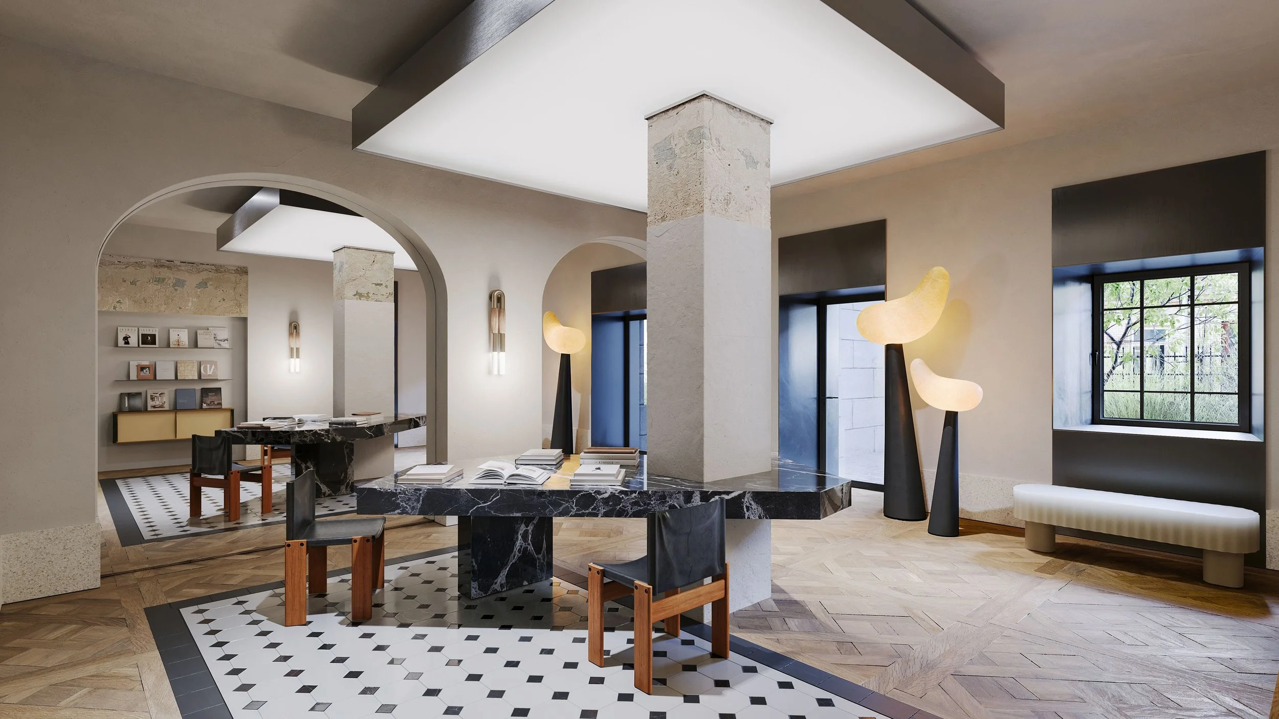 The envisioned interior of the BAS28 commercial space offers a sophisticated blend of heritage and contemporary design, creating an environment that both honors the building's historical significance and incorporates modern, artistic expression which reveals itself in accent pieces.